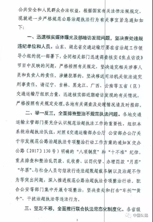 1月23日,中央電視臺(tái)《焦點(diǎn)訪談》欄目以“沉重的超載”為題,報(bào)道了山東和湖北兩省部分地區(qū)在公路治超執(zhí)法過程中,存在的“車托”“黃?!薄霸缕薄钡葐栴}。此前,我部結(jié)合規(guī)范公路治超執(zhí)法專項(xiàng)整治行動(dòng),組織力量,分三批次赴八個(gè)省份開展了明察暗訪,也發(fā)現(xiàn)各地不同程度地存在著“黃?!?、治超不作為等現(xiàn)象,并通知各地調(diào)查核實(shí),嚴(yán)格按照規(guī)定處理。為貫徹落實(shí)黨的十九大精神,進(jìn)一步優(yōu)化營(yíng)商環(huán)境,切實(shí)維護(hù)社會(huì)公共安全和人民群眾合法權(quán)益,根據(jù)國(guó)家有關(guān)法律法規(guī)規(guī)定,現(xiàn)就進(jìn)一步嚴(yán)格規(guī)范公路治超執(zhí)法行為有關(guān)事宜緊急通知如下: